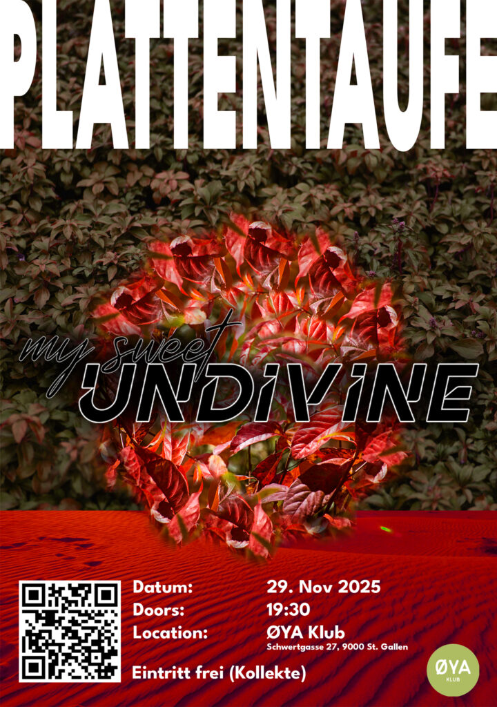 Eine Geschichte der Sanduhr – Live, laut und endlich da. Mit ihrer Konzept-EP RED entführen My Sweet Undivine in eine rötliche Wüstenwelt, in der eine Gestalt erwacht, schöpft, kämpft, zweifelt und schliesslich Frieden findet. Über fünf Kapitel entfaltet sich eine poetische Reise – vom ersten Funken des Lebens bis zur Erkenntnis, dass alles vergänglich ist. Musikalisch verschmelzen treibende EDM-Beats, progressive Rock-Riffs und jazzige Vocals mit den mystischen Klängen von Santur, Kemenche, Saz, Cura und Duduk. Eine Fusion aus West und Ost, zwischen Fernweh und Ankommen, zwischen Traum und Realität.